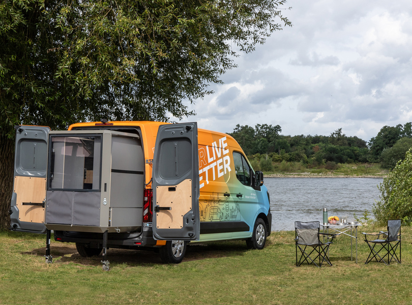 mid Groß-Gerau - Blick von schräg hinten auf einen grün-orangen Nissan Interstar mit PlugVan Wohnmodul, das man durch die geöffnete Hecktür sieht. Nissan