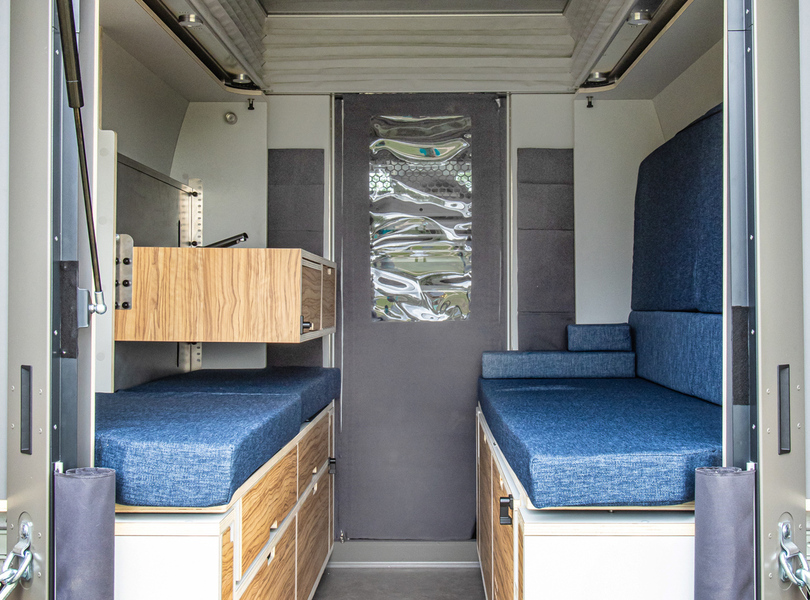 mid Groß-Gerau - Blick durch die geöffnete Heckklappe in den Innenraum des PlugVan Wohnmoduls im Nissan Interstar mit braunen Schränken und blauen Sitzkissen. Nissan