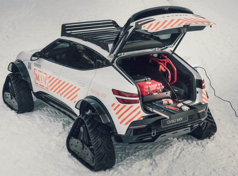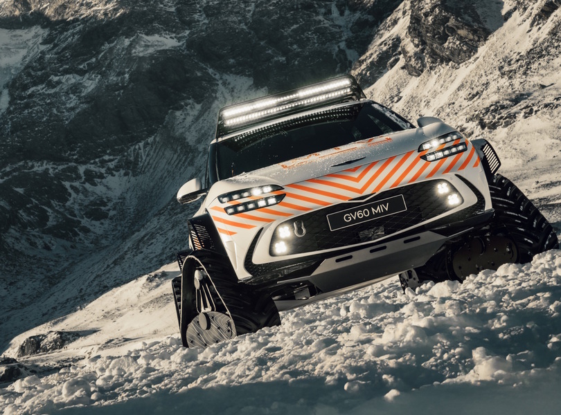 Um verletzte Alpinisten von steilen Hängen bergen zu können, braucht es Fahrzeuge mit extremer Kraxel-Kompetenz. Die hat Genesis nun seinem Elektro-Feger GV60 verliehen.