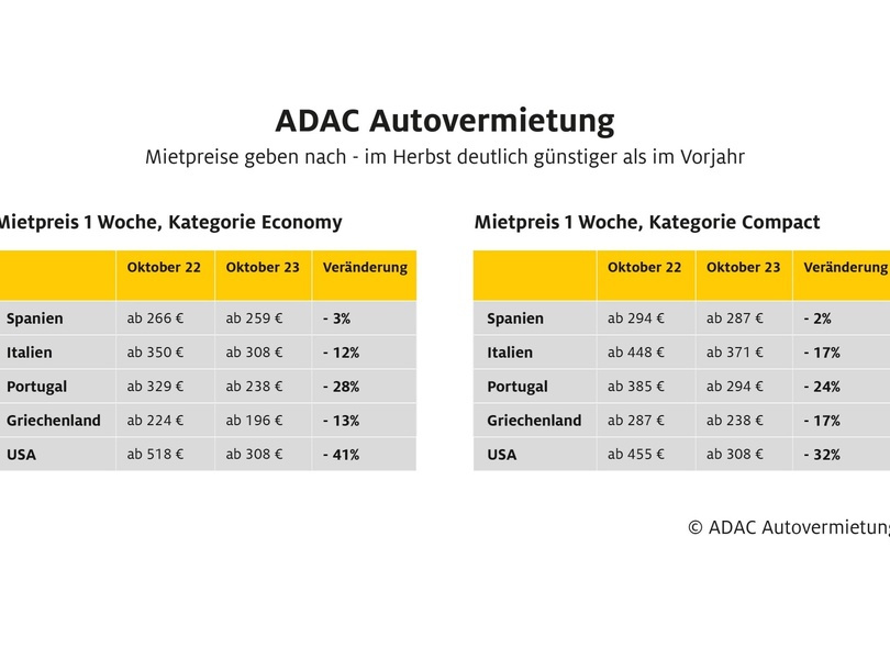 Der 'goldene' Herbst macht Lust auf Reisen. Dazu gehört für viele auch ein Mietwagen. Ein Vergleich der ADAC Autovermietung zeigt, dass die aktuellen Mietwagenpreise in den Urlaubsländern deutlich günstiger sind als noch im Herbst des Jahres 2022.